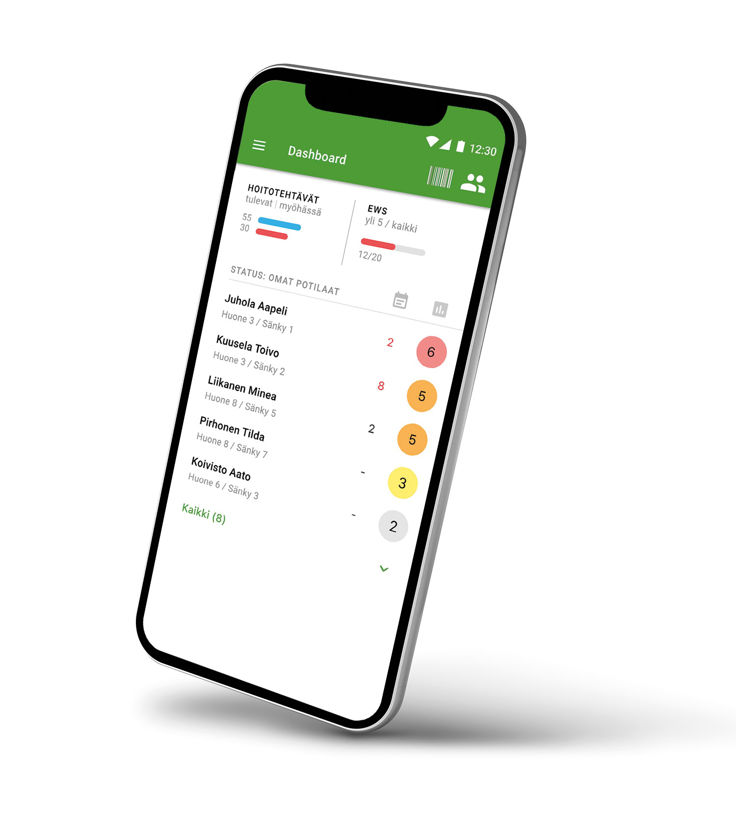 TIlannekuva kertoo yhteenvedon osaston potilaiden tilasta. Se näyttää listan kärjessä potilaat, joiden EWS-pistemäärä on korkea ja jotka tämän myötä mahdollisesti vaativat ensimmäisenä hoitotoimenpiteitä. EWS-tuloksen värikoodaus tekee tästäkin toiminnallisuudesta visuaalisesti selkeän. Tilannekuva näyttää myös kunkin potilaan kohdalla tulevat ja myöhässä olevat hoitotehtävät.