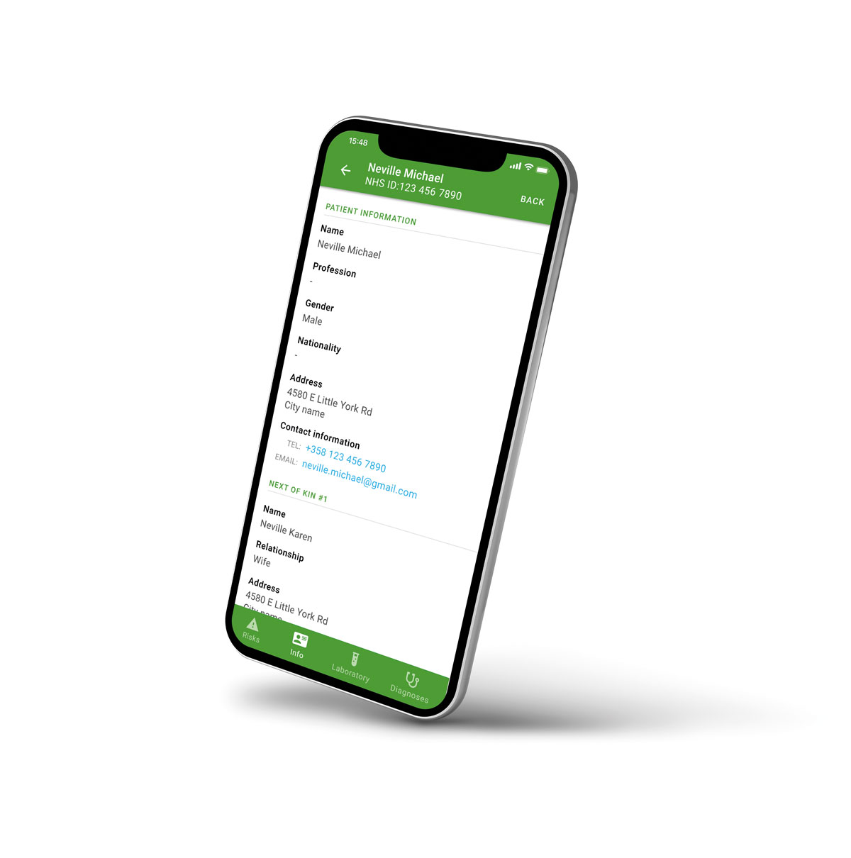 The feature permits the user to view a patient’s basic demographic and clinical information, such as diagnosis, allergies, patient alerts/risks and lab results. The patient card also contains the contact information of the patient’s next of kin, who can be called directly from the app.